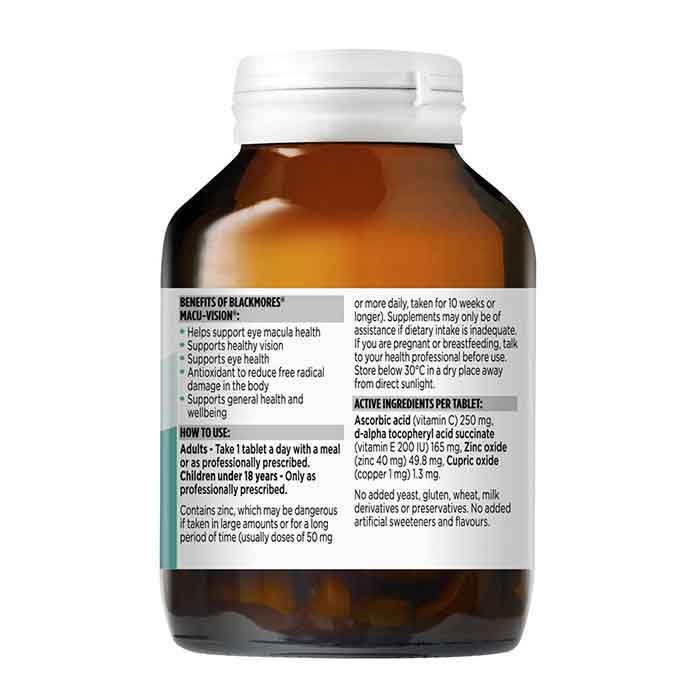Viên uống bổ mắt Blackmores Macu Vision chứa các chất dinh dưỡng chống oxy hóa để giúp hỗ trợ sức khỏe điểm vàng của mắt và thị lực khỏe mạnh.