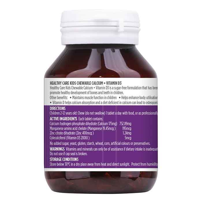 Viên nhai bổ xương Healthy Care Kids Calcium Vitamin D3 có thành phần: