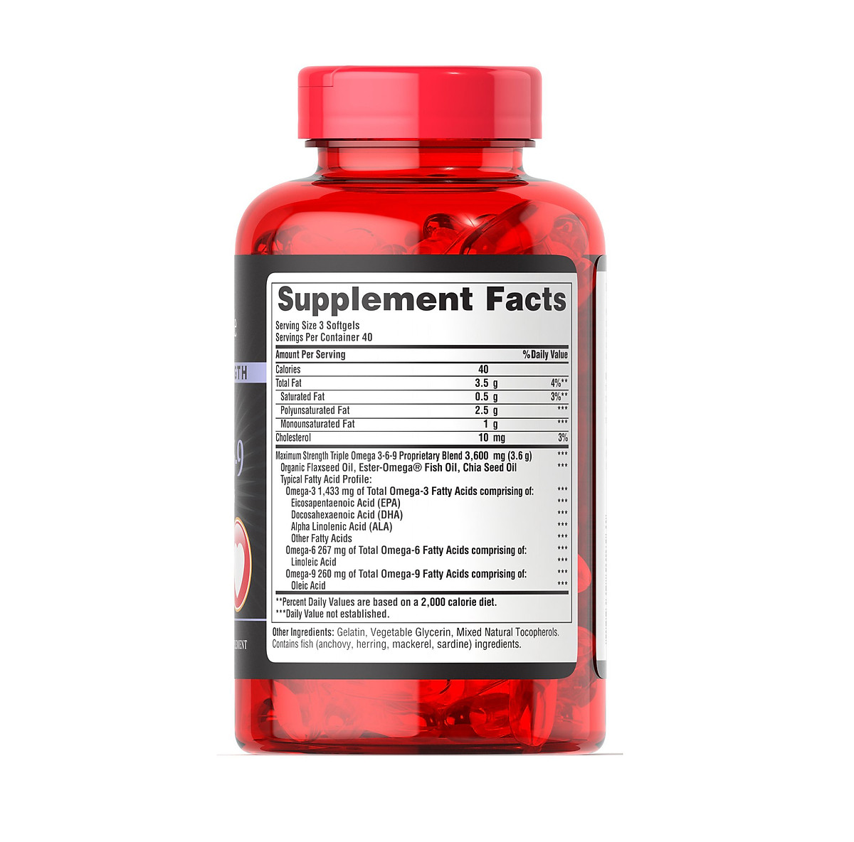 Viên uống hỗ trợ tim mạch Maximum Strength Triple Omega 3-6-9 (hiệu quả tối đa) chứa các axit béo từ hạt lanh, cá và dầu cây lưu ly (1200 mg) cộng với 50% giá trị Vitamin E hàng ngày của bạn. Công thức tuyệt vời này là một trong những cách tốt nhất để hỗ trợ sức khỏe tim mạch. Nghiên cứu khoa học gần đây nhấn mạnh tầm quan trọng của việc bổ sung axit béo Omega. Axit béo – Omega-3, Omega-6 và Omega-9 – là những chất béo “tốt” quan trọng cho sức khỏe tế bào, tim và trao đổi chất.