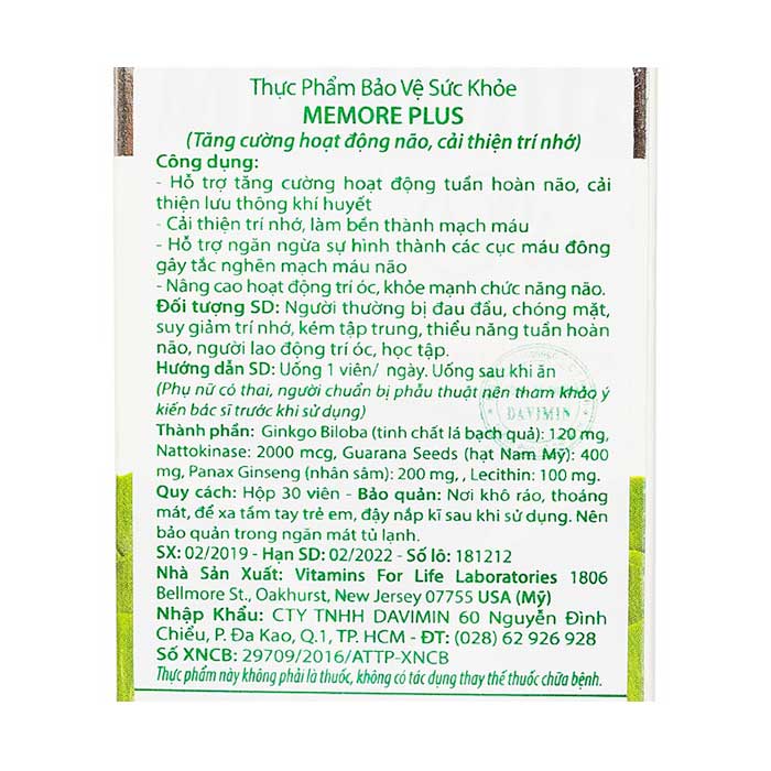 - Ultra Memore Plus hỗ trợ tăng cường hoạt động tuần hoàn não, cải thiện lưu thông khí huyết.