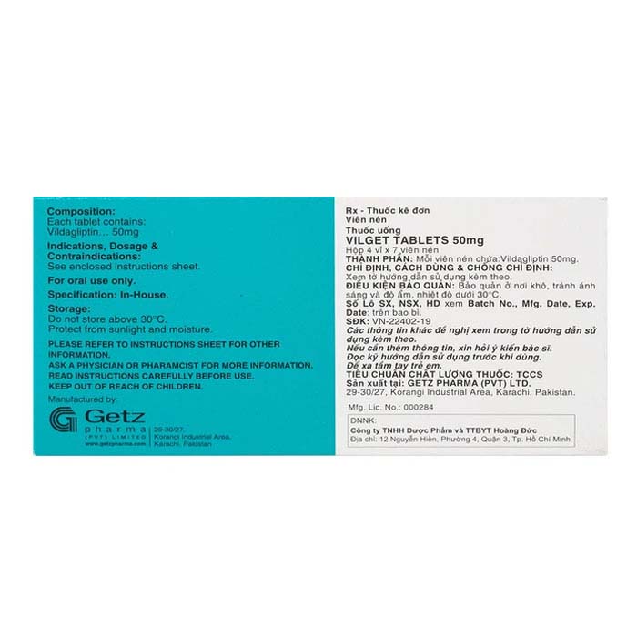 Liều khuyến cáo Vilget Vildagliptin 50mg 1 lần hoặc 2 lần mỗi ngày. Liều tối đa của Vilget Vildagliptin 100mg. Viget (Vildagliptin) có thể uống chung cùng hoặc không cùng với thức ăn.